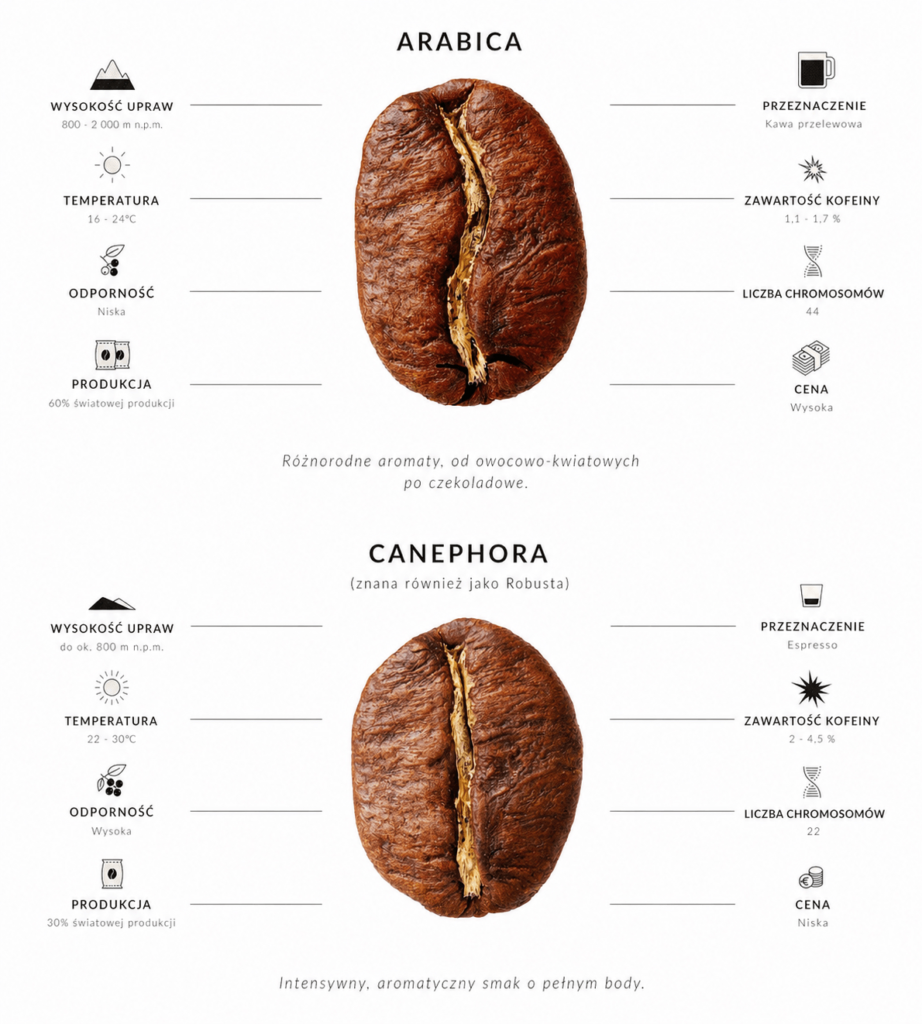 Niezależnie od tego, czy zwykle pijecie małe czarne espresso czy spienione i kremowe cappuccino, są szanse, że słyszeliście o ziarnach arabica i robusta. Czy jednak wiecie, jaka jest różnica między tymi dwoma rodzajami ziaren? W tym wpisie postaramy się wyjaśnić, dlaczego ich smak może się bardzo różnić, przyjrzymy się ich popularności i zastosowaniu. Podamy Wam też kilka wskazówek, jak najlepiej wykorzystać ich właściwości!